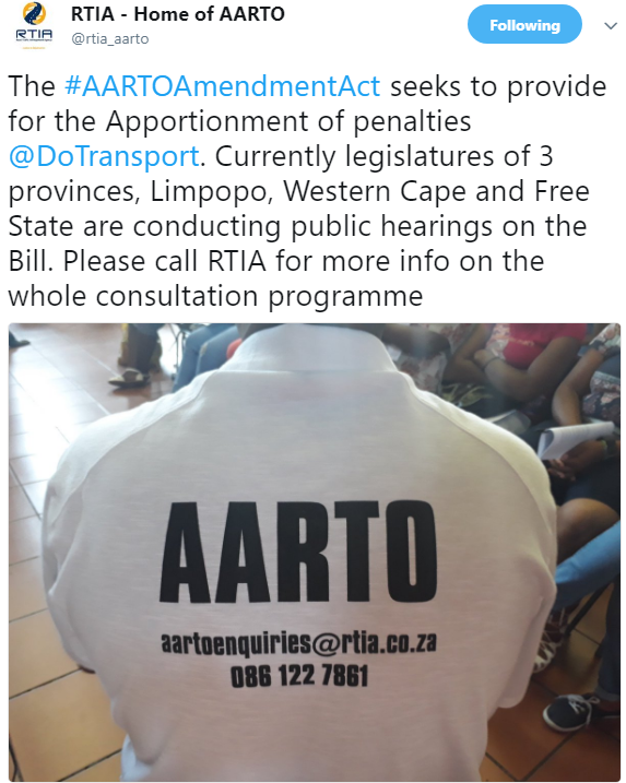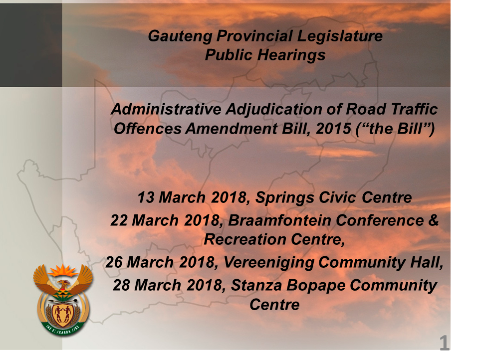Public hearings were held in the various provinces between 9 February 2018 and late April 2018. At all of these hearings, the senior executives of the Road Traffic Infringement Agency, Japh Chuwe and Thabo Tsholetsane (COO) gave differing PowerPoint presentations, while being introduced as the representatives from the Department of Transport, (which neither of them are).
